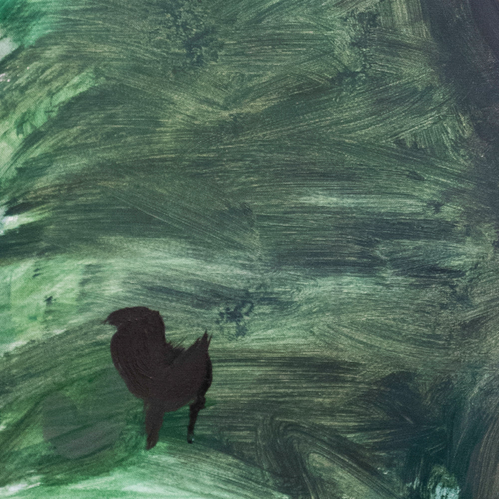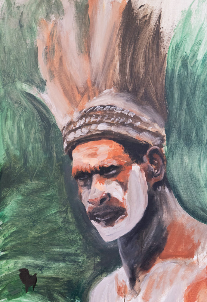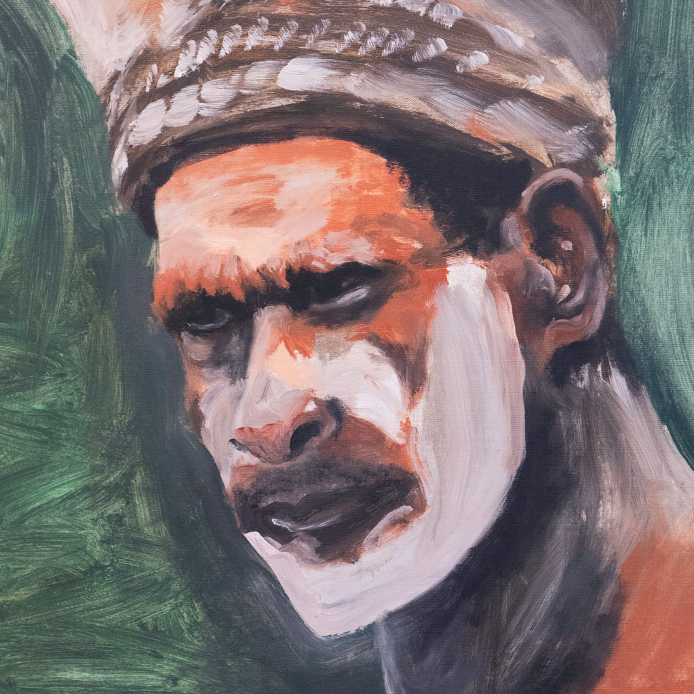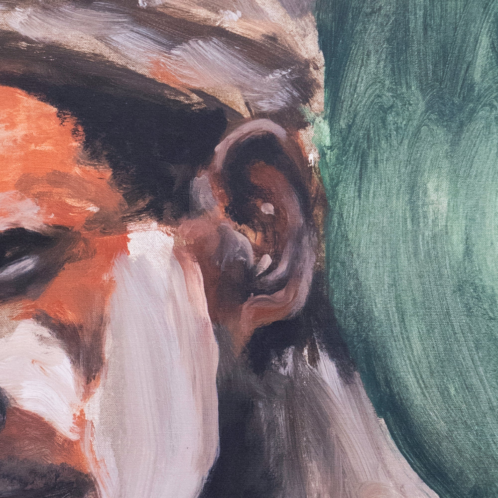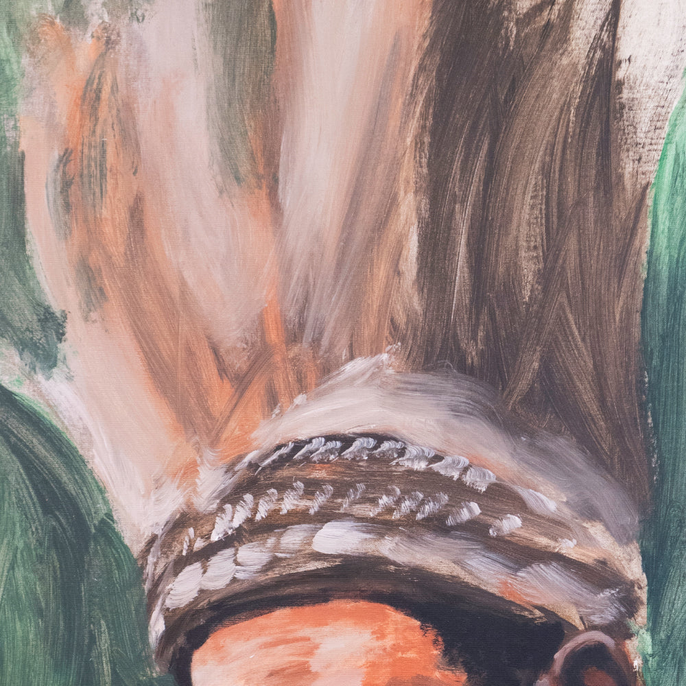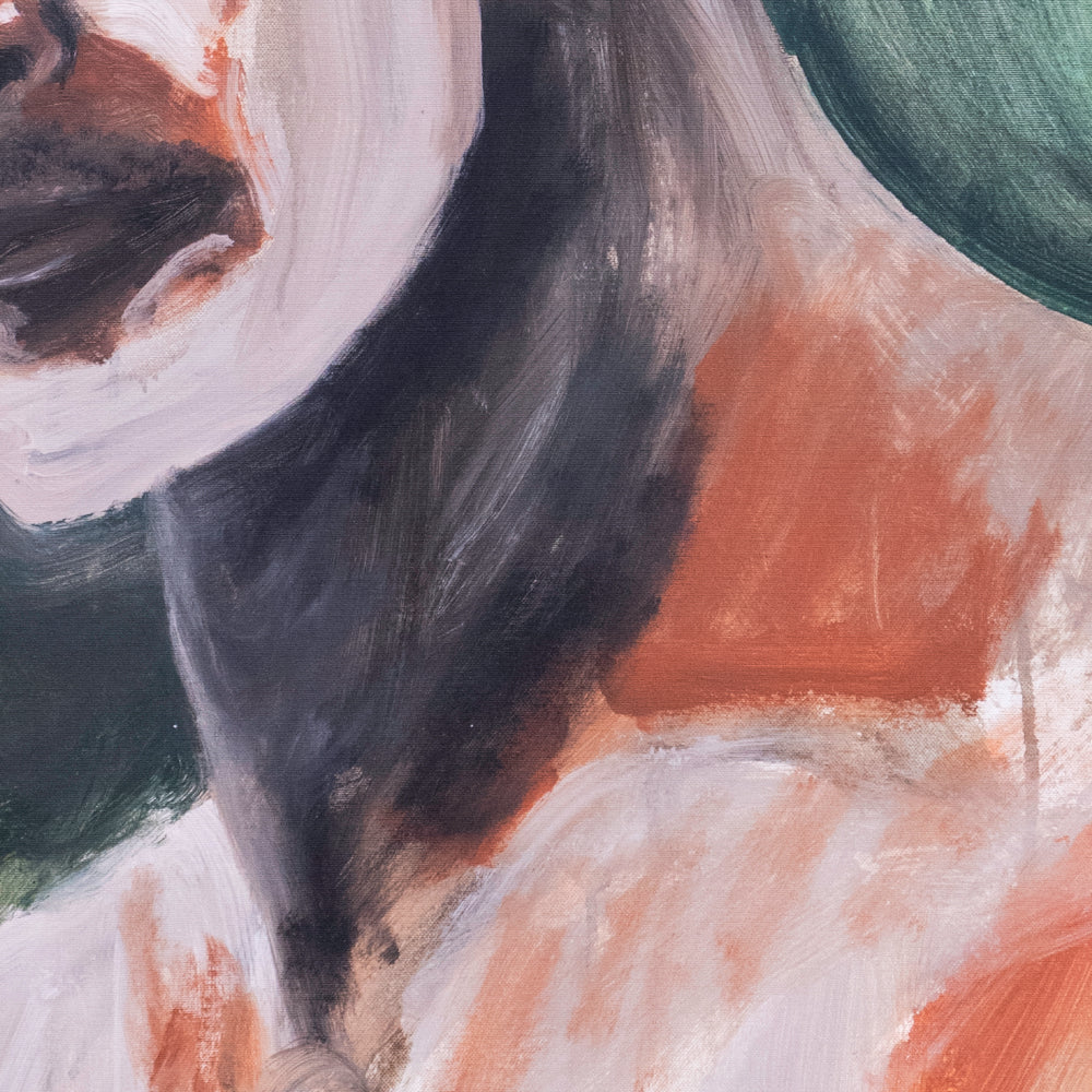 Pinté esta obra dejando que me guiara el instinto. Era la primera vez que trabajaba en un lienzo de gran formato, y en esa amplitud encontré libertad. Este retrato imaginado nace del deseo de viajar a África, pero también de una pregunta más profunda: ¿cómo es mirar el mundo cuando todo depende del ahora?