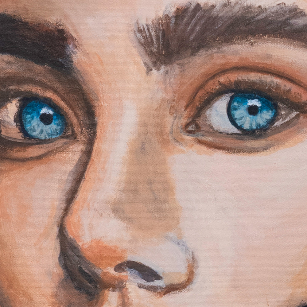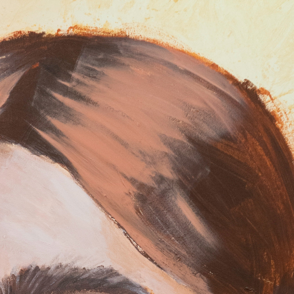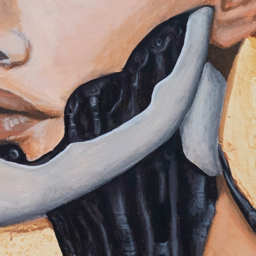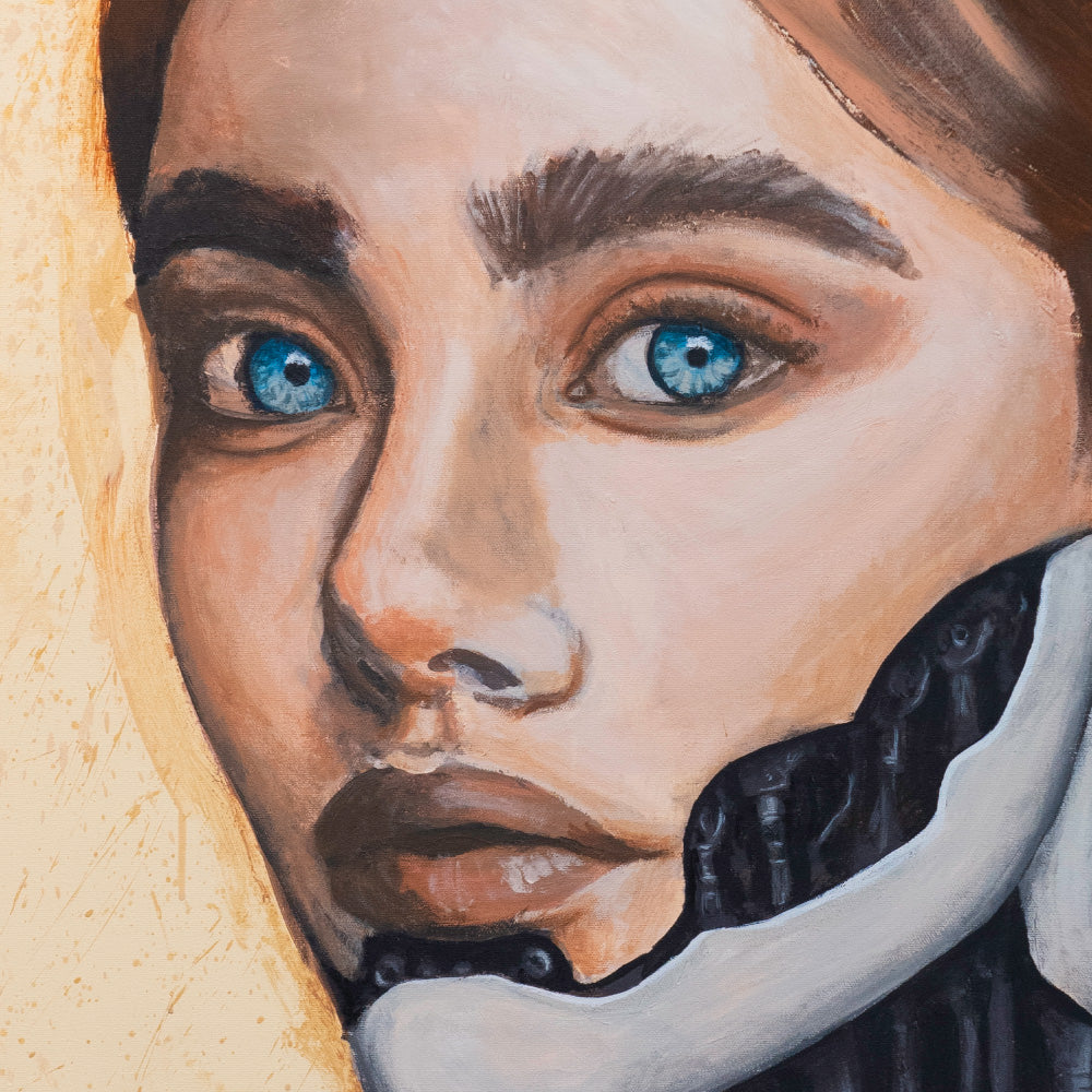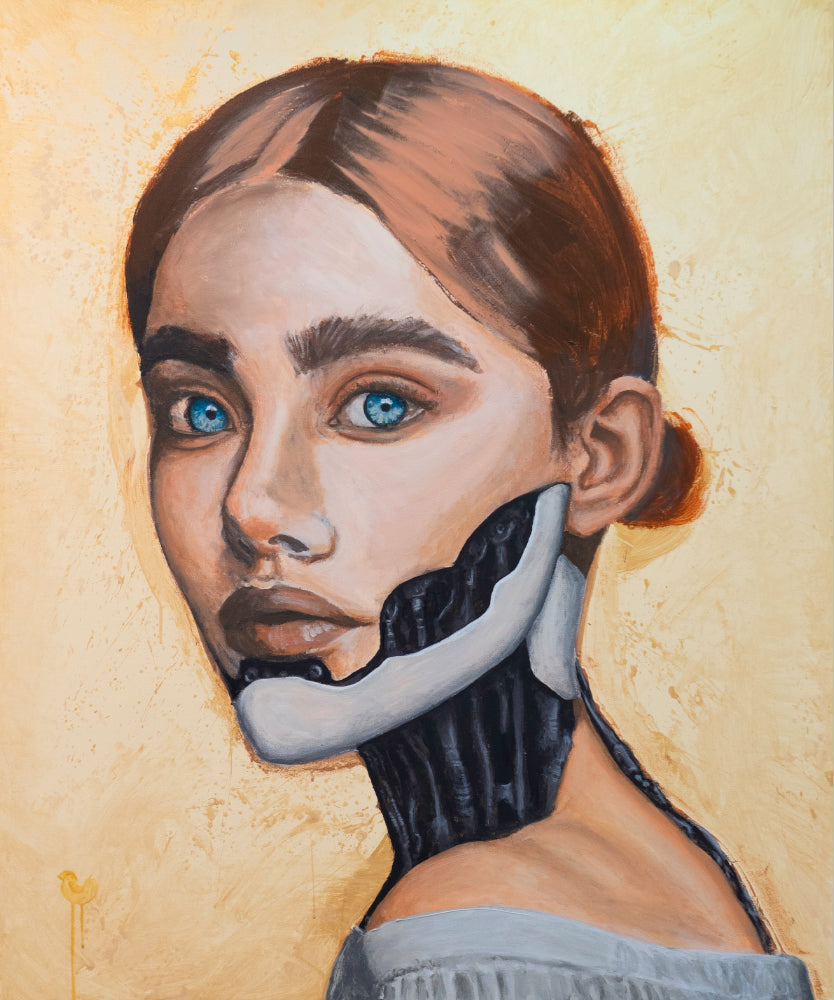 El fondo blanco y dorado enmarca su figura como si fuera un anuncio, una portada, un icono. Pero tras esa mirada serena también se adivina algo más: la consciencia de saberse admirada sin ser conocida. No hay crítica aquí, solo una imagen congelada del mañana. Martina no busca convencerte de nada. Solo está ahí, como tantas otras figuras del presente… perfecta, distante, y luminosa.